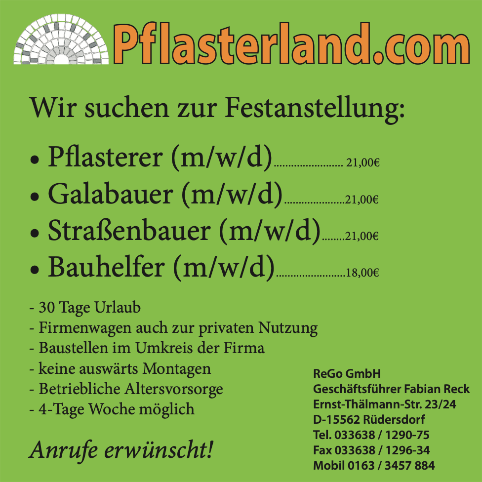 Mit der Bildung einer Eigenmarke: „Pflasterland“ erfolgt der Handel mit Platten, Pflaster, Klinker und Naturstein. In unserer großen Musterausstellung erfolgt eine individuelle Beratung. So können sich unsere Kunden auch den exakten frostsicheren Oberbau gem. RstO 12 für Pflaster- und Wegebau berechnen lassen.